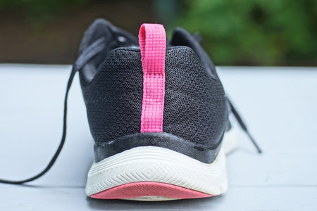 one back of sneaker shoe made of black pink fabric with white plastic sole stands on gray table