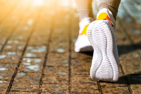 Woman feet. Girl walking on road under sunlight.