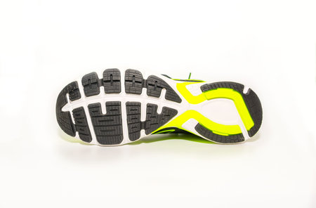Sole with treads on sneakers on a green background, sneakers with the sole up.