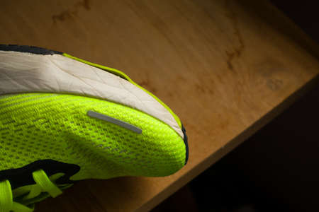 Paris, France - Jul 8, 2019: Side view of new Nike Zoom Fly Flyknit 2 running shoes on wooden table detail of sole
