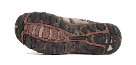 close up of a shoe sole with mud on it on white background