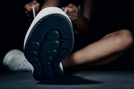Woman hands tying shoelaces on sneakers on a dark background. Fitness athlete ready for exercise