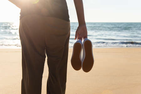 Woman hands holding shoes at the beach during sunset time,Back view