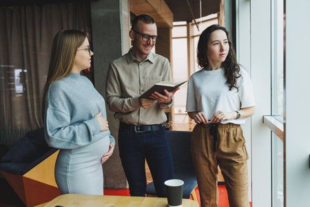 Modern pregnant woman working in office with colleagues. A young successful man helps a pregnant colleague at work. A beautiful pregnant woman works in the office. Modern pregnant woman