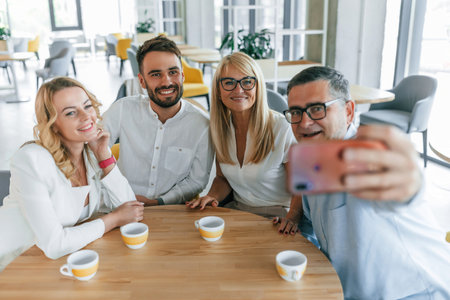 Cheerful business colleagues taking selfie together in modern office setting showcasing teamwork and collaboration