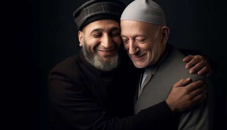 Two Muslim men hugging and smiling. Eid mubarak concept. Islam friends or business partners embracing each other. Arabic men having warm meeting close up