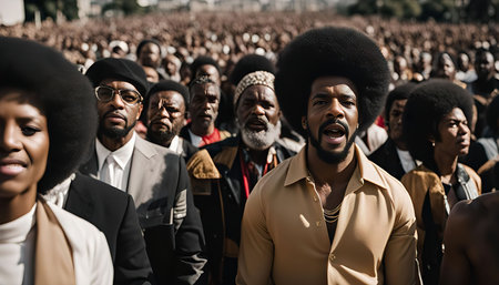 A photo capturing a powerful moment in a large gathering of black people. The image showcases a powerful message of unity, struggle, and hope.