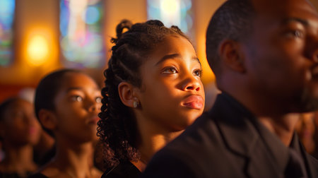 People at church service. Religious holiday. Church prayer.Black children in church.
