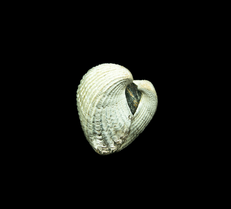 Detailed view of a white seashell with natural ridges and color variations isolated on a black background