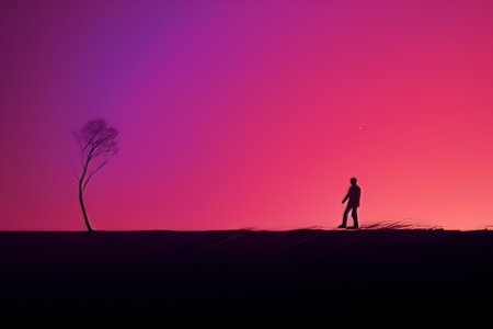 Stunning silhouette of a solitary tree against a vibrant sunset sky. This serene landscape embodies tranquility and natural beauty, perfect for calming visuals.