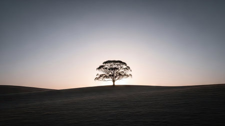 A single tree stands silhouetted on a gentle hill, its foliage outlined against a gradient sky. The scene is bathed in soft, diffused light, suggesting either sunrise or sunset. The composition, with its vast copy space, could be suitable for various editorial or commercial applications.