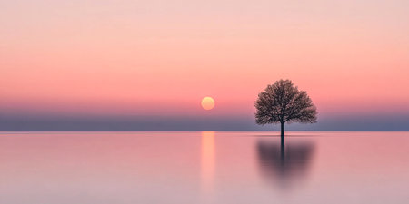 Minimalistic peaceful landscape with lonely tree. Nature background with tree silhouette and reflections in water. Calm and tranquility mood