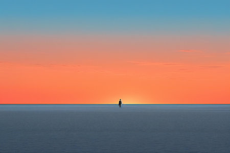 A person stands facing a soft glowing horizon during sunset, observing the colors of the sky and lost in thought.