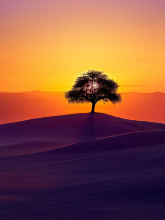 Golden-hour sunset with a single tree on a grassy hill, tranquil and serene, as the sky shifts from orange to deep purple