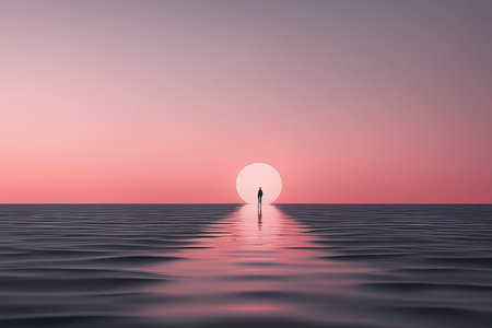 A person looks toward a soft glowing horizon during sunset, surrounded by a reflective surface that enhances the colors of the sky.
