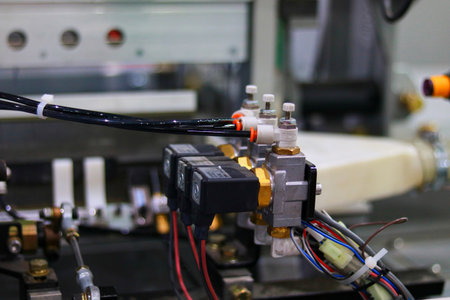 Close-up of industiral machine element. Wires and pipes.