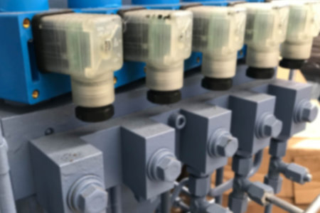 Bangi, Malaysia - August 28, 2019: Close up view of 4/3 ways Solenoid Operated Directional Valves connected to hydraulic circuit on a industrial electrical hydraulic pressing machine. Selective focus.