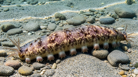 A close-up underwater shot of a patterned sea cucumber (holothurian) crawling along a sandy ocean floor mixed with small pebbles. The image details the texture and tube feet of this marine echinoderm in its natural habitat.