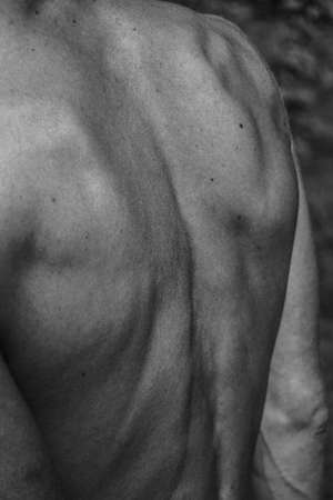 Dark close up studio shoot of strong masculine athletic man. Upper torso and chest. Black and white photo.
