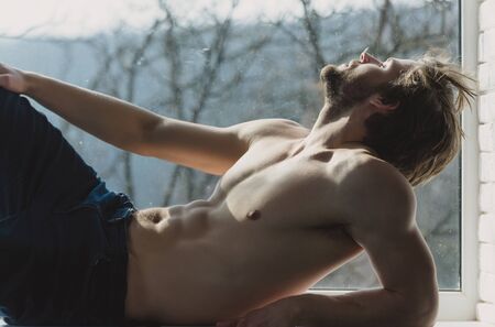 Handsome man or muscular, sexy macho with fit, naked torso, six packs, abs, biceps, triceps lying on window sill on blurred natural background. Face with closed eyes, relaxing and day dreaming