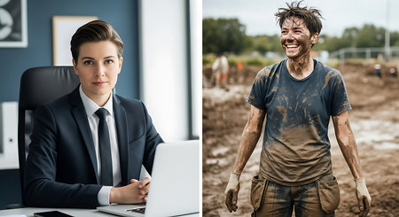 Professional versus dirt-covered worker contrast for diverse career choices. Job type comparison side-by-side portrait shows different occupations.