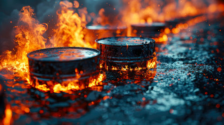A captivating abstract image featuring industrial barrels illuminated with glowing orange and red hues, highlighting textures and creating a dramatic atmosphere.