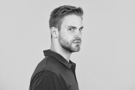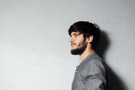 Profile portrait of serious young bearded guy with on background of grey.