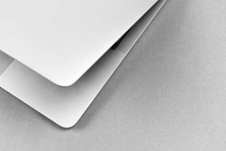 Laptop on a white table. Close-up. Monochrome.