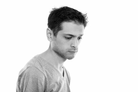 Studio shot of sad young man looking down