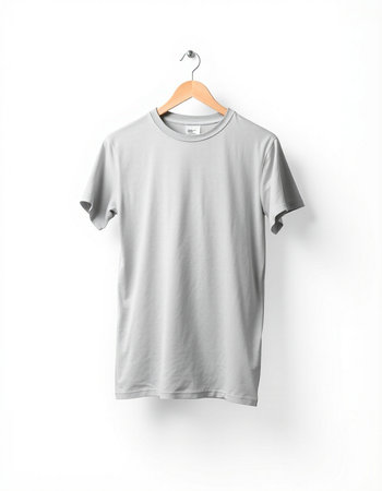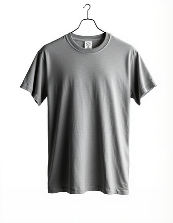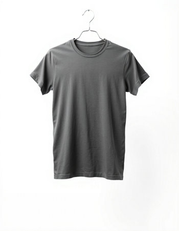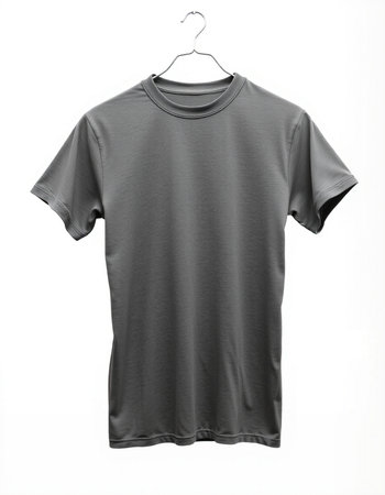 Gray t-shirt on a hanger on a white background.