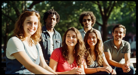 A group of young friends sitting together in a park on a sunny day