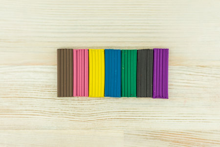 things for the development of children's abilities: 7 pieces of clay of different colors lie horizontally in a row wooden Desk white color