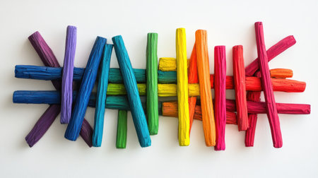 Group of colored sticks or posts forming a heart, on white background. Symbols of love and unity.