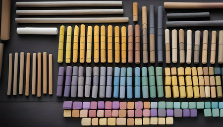 A variety of pastel colors arranged on a black surface, showing a range of hues, shades, and tints