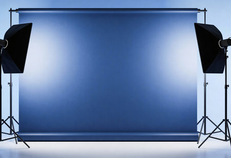 Empty photo studio with lighting equipment and blue wall. 3D Rendering