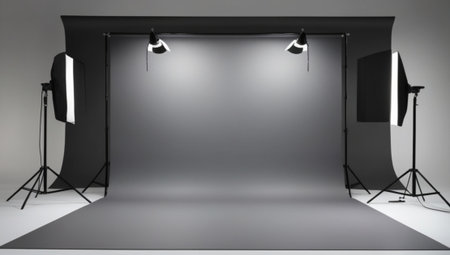 Empty photo studio with lighting equipment. Mock up, 3D Rendering