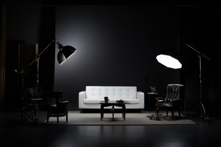 Sophisticated Studio lighting room isolated on black. Concert spot glowing film stage. Generate Ai
