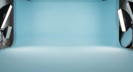Blue studio with lighting equipment. 3d rendering. Computer digital drawing.