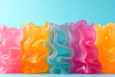 Vibrant jelly layers in shades of pink orange blue and yellow create a striking display against a light blue background.