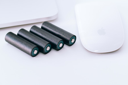 Batteries arranged next to each other on a light surface. Batteries, energy and respect for the environment. Alkaline or rechargeable batteries.