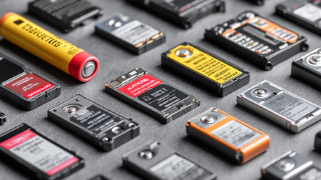 spent used rechargeable Nickel Metal Hydride (Ni-MH) battery, grey background, flat lay