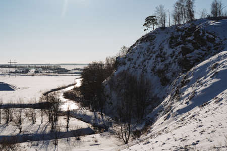 The river flows next to the rock, the winter landscape, the glare of the sun is reflected in the water. high quality photo