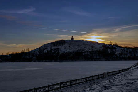Panoramic view of new buildings in Krasnoyarsk. Orange sunset in winter on the banks of the ice-free Yenisei River in a city in Russia. New buildings and a newly built neighborhood with a beautiful view on the hill. A breathtaking winter sunrise illuminates the snowy cliffside in a vibrant urban landscape