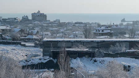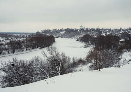 View from the hill on leafless trees and small garden houses on the bank of frozen river. winter landscape.
