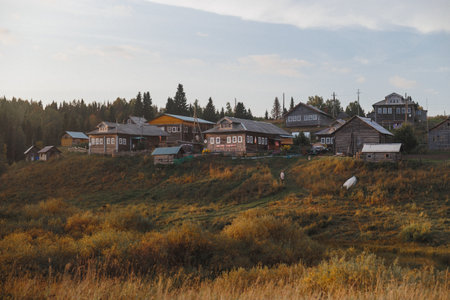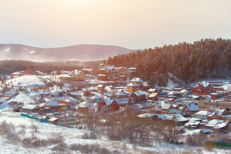 View of the village of Chernoistochinsk Sverdlovsk region from the top of the mountain at sunset in autumn