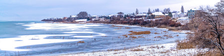 Panoramic view of scenic Utah Lake with frozen water on a snowy winter day