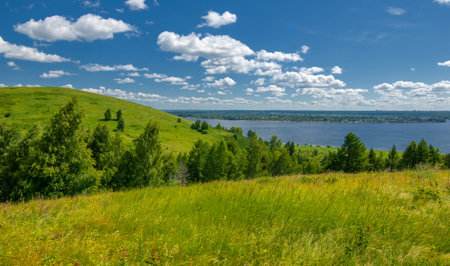 Summer water meadows, river floodplain, photograph taken from the mountain. Lush green grass, pine, birch, hazel grow along the edge of the river. hot summer days