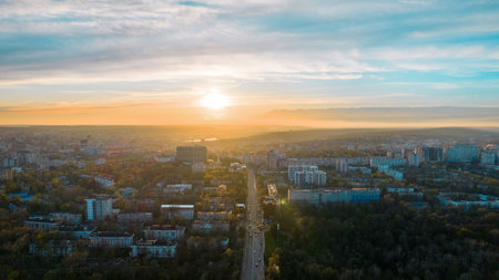 Aerial drone view of Chisinau at sunset, Moldova. Residential district with multiple flats, greenery, road with moving cars