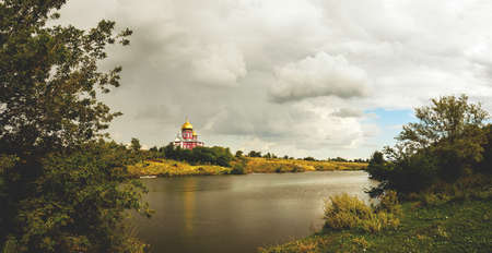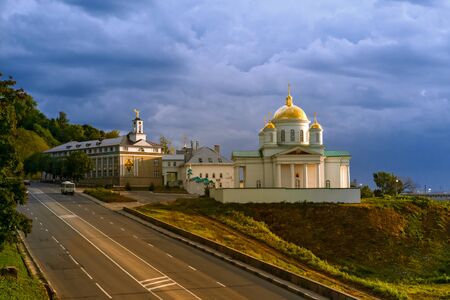 Borovskiy, Russia - May 3, 2015: Temple for sake of Saint Nikolay Chudotvorts and city quarters at sunset