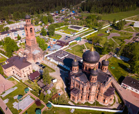 Guslitsky Transfiguration Monastery of city Kourovskoe from helicopter. Moscow region.